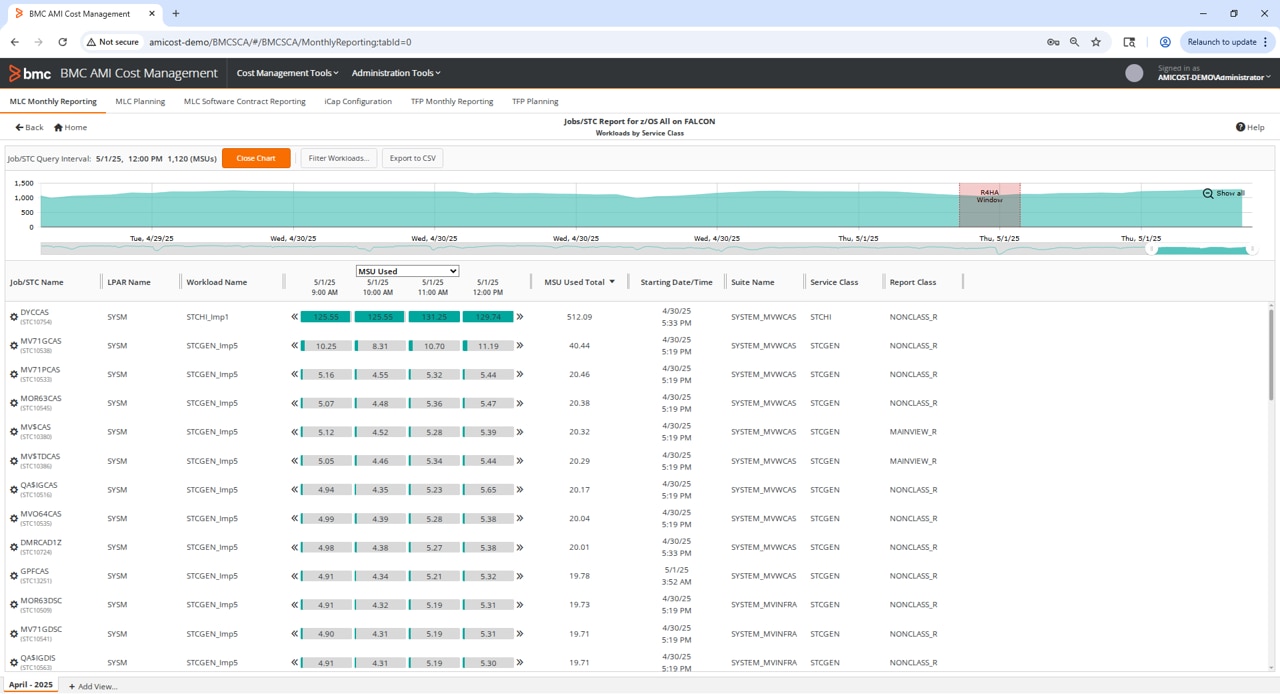 Die modernste Schnittstelle stellt Kosten- und Nutzungskennzahlen vollständig und dennoch prägnant dar, einschließlich der wichtigsten Faktoren für den Spitzenverbrauch, die zu den Mainframe-Lizenzkosten (MLC) beitragen